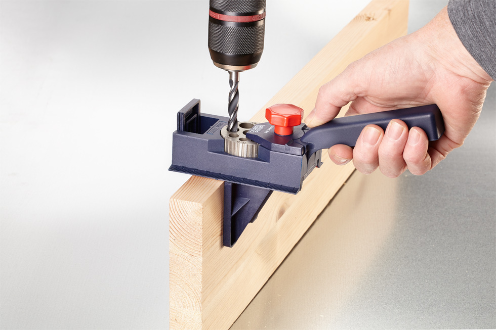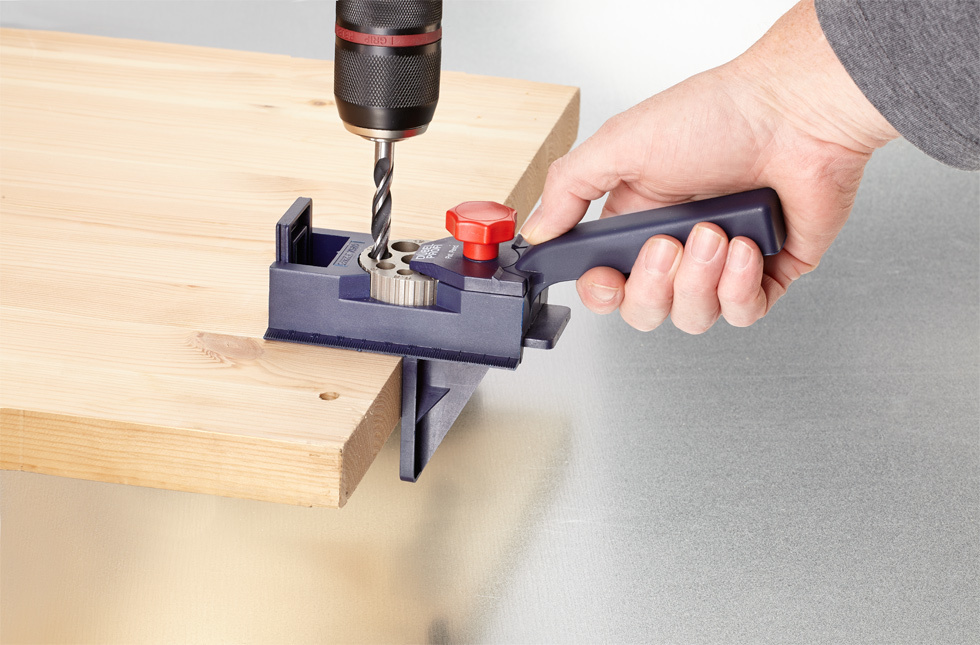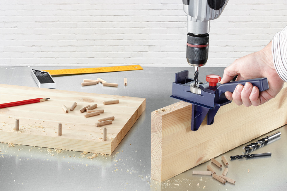 Aangezien het gat precies in een hoek van 90 graden ten opzichte van de rand van het hout staat, kan het zijn dat zelfgemaakte deuvels niet het gewenste nauwkeurige resultaat opleveren. Daarom worden standaard 150 deuvels (6-8-10 mm) meegeleverd. De verstelbare boormal kan vooraf worden ingesteld, zodat elk gat precies groot genoeg is en aansluit bij de deuvel.