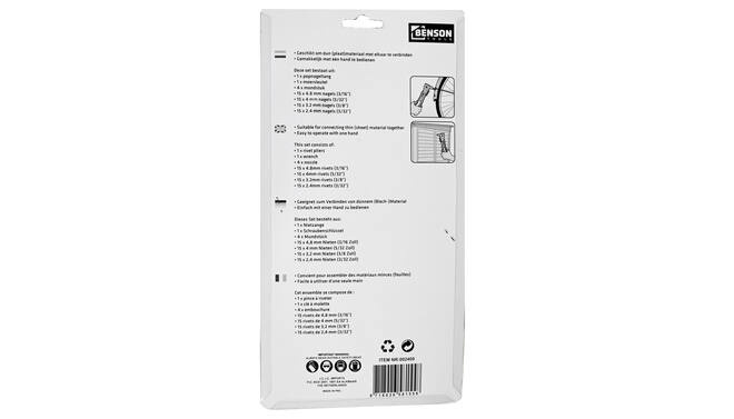 De Benson Popnageltang is ideaal voor het eenvoudig verbinden van dunne materialen, zoals plaatmateriaal. Deze tang is ontworpen voor bediening met één hand, wat het bevestigen van nagels snel en comfortabel maakt. De set wordt geleverd met een selectie nagels in verschillende maten, zodat u direct aan de slag kunt.